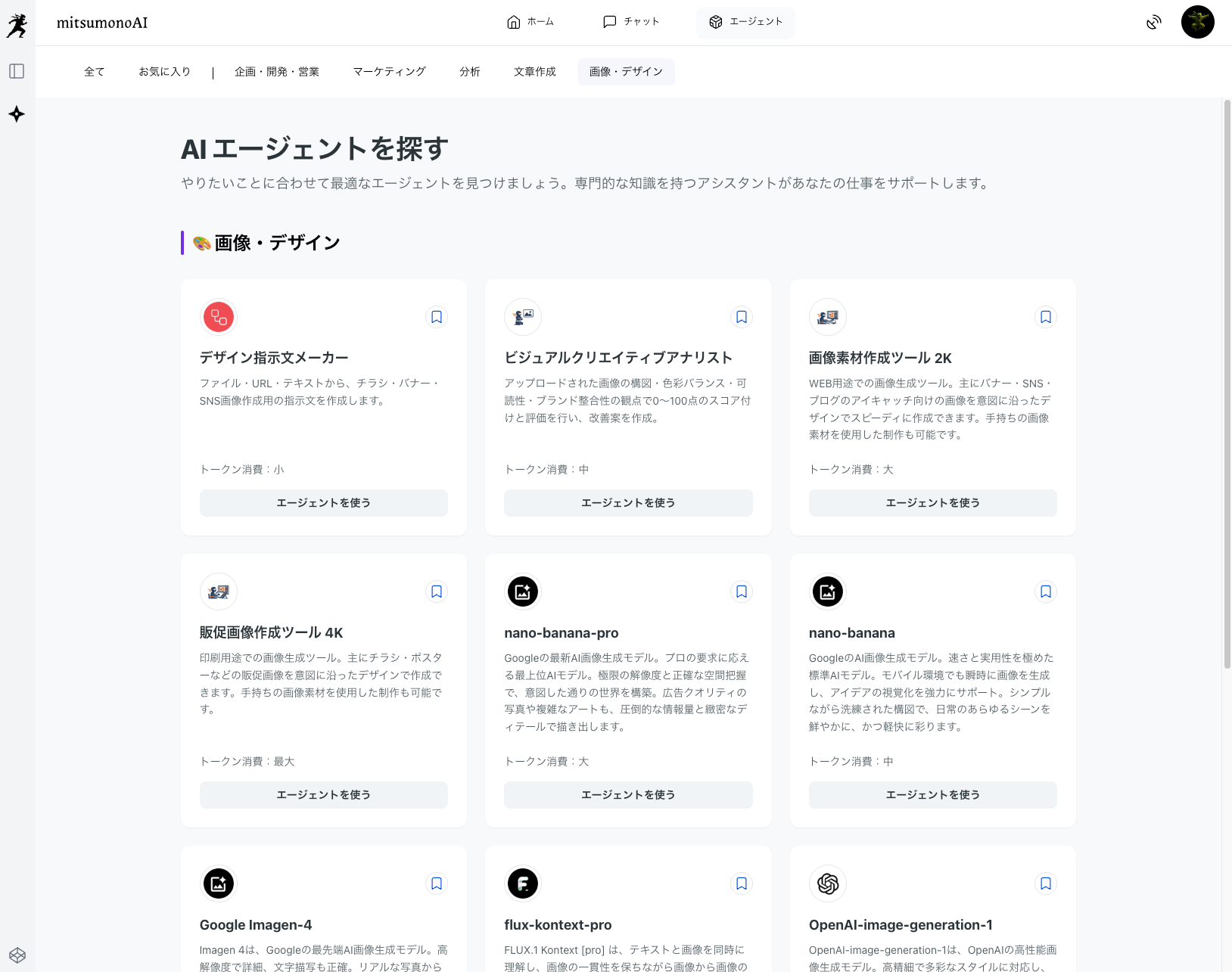 多数のエージェントの中から、現在のタスクに最適なエージェントや画像生成ツールなどを、用途別に素早くフィルタリングして選択いただけます。