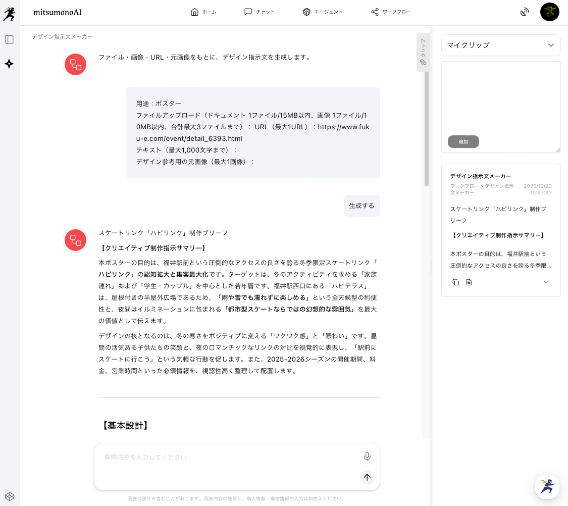 AIは、駅前という立地の良さや「屋根付きで雨天OK」という独自の価値を瞬時に抽出します。出力された「クリエイティブ制作指示サマリー」には、ターゲット(ファミリー層やカップル)に刺さるメッセージや、冬のワクワク感を演出する配色案がまとめられます。