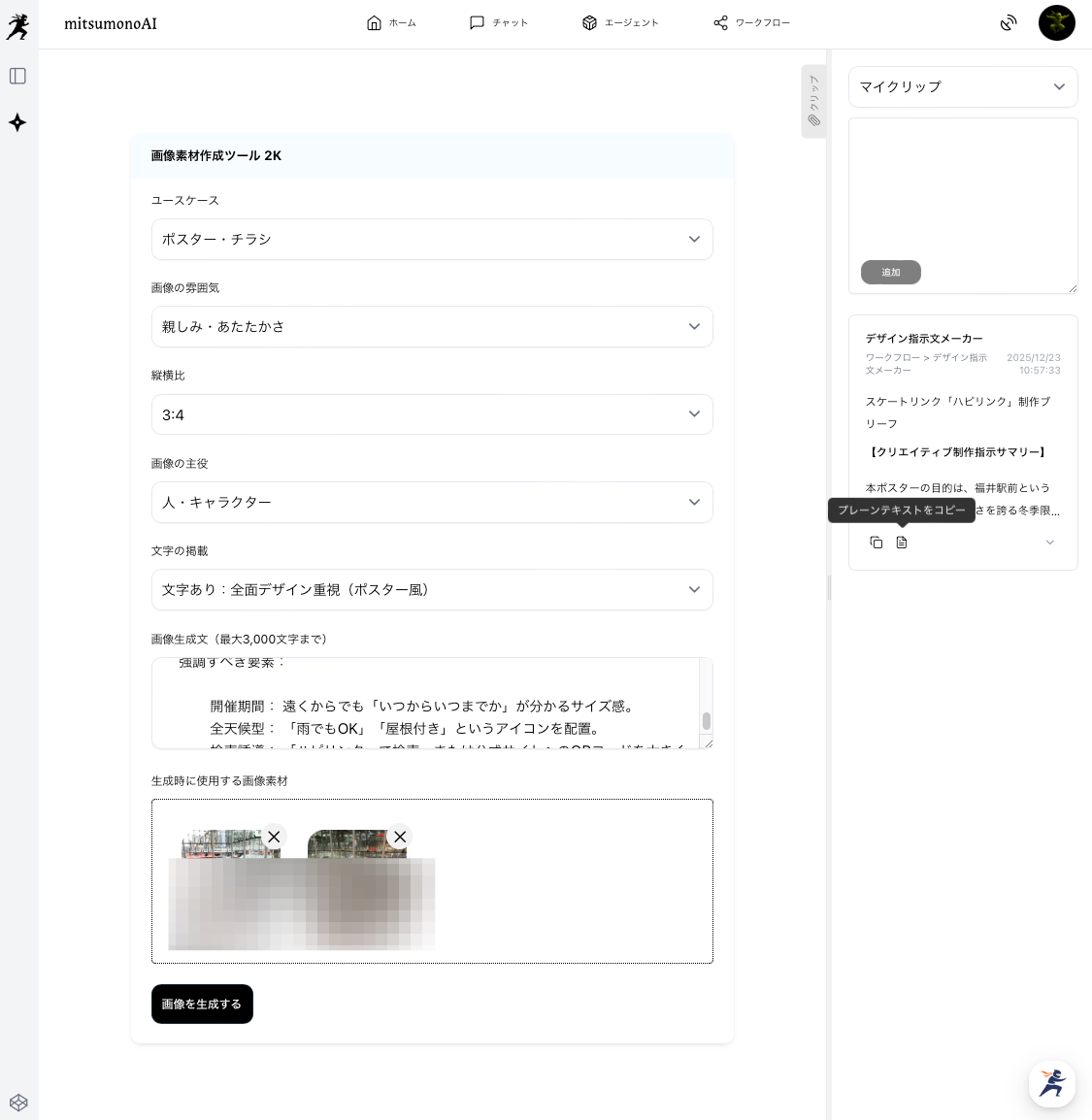 設計図ができたら、次はそれを形にする作業です。「画像素材作成ツール 2K」を使えば、先ほどの指示書を貼り付けるだけで、目を引くビジュアルが完成します。