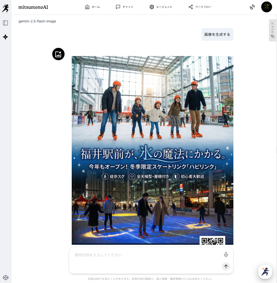 そんな悩みを解決するのが、AIツール「mitsumonoAI」です。この記事では、URLを入力するだけで、プロが制作したような「冬季限定スケートリンク」のポスターを作成する具体的な手順を解説します。